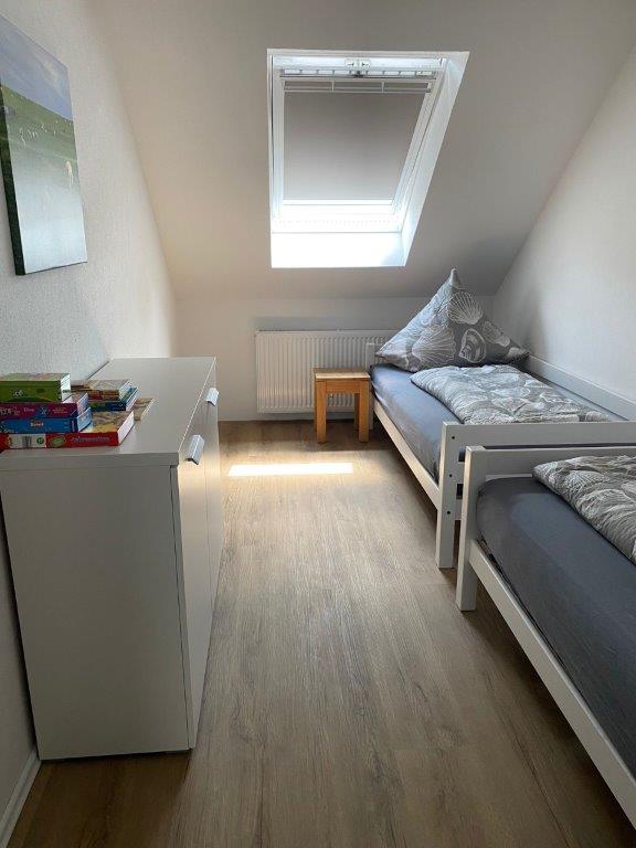 eine Wohnung mit 2 Schlafzimmern, Doppelbett und 2 Einzelbetten.